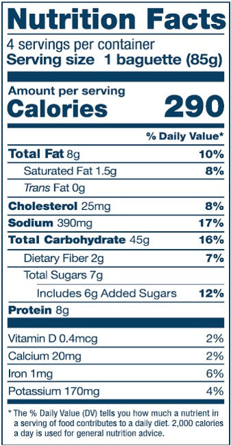Ingredients: wheat flour, eggs, water, canola oil, sugar, yeast, salt, mono- and diglycerides, wheat gluten, natural flavor, butter, deactivated yeast, malted wheat flour, acerola extract, maltodextrin, milk proteins.